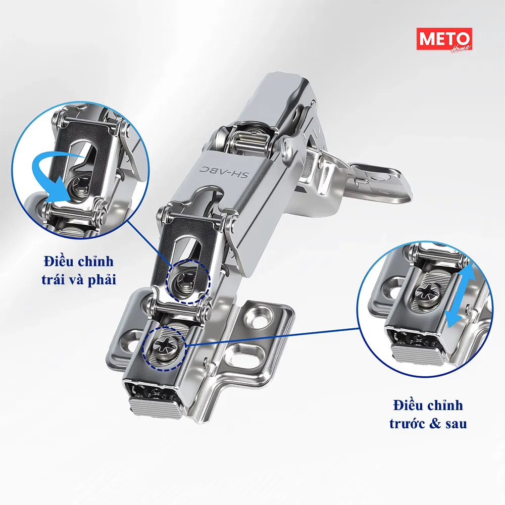 Trên thân bản lề FE165 có các vít tinh chỉnh cho phép bạn điều chỉnh cánh cửa theo 3 hướng: